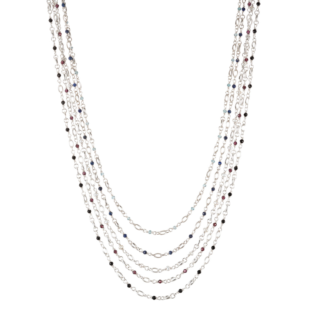 A sterling silver lariat necklace with stone or pearl pieces inlaid into the chain and tassel pendants at each end of the strand. A lariat ‚� style necklace has a long, continuous chain with a unique way of clasping the necklace.