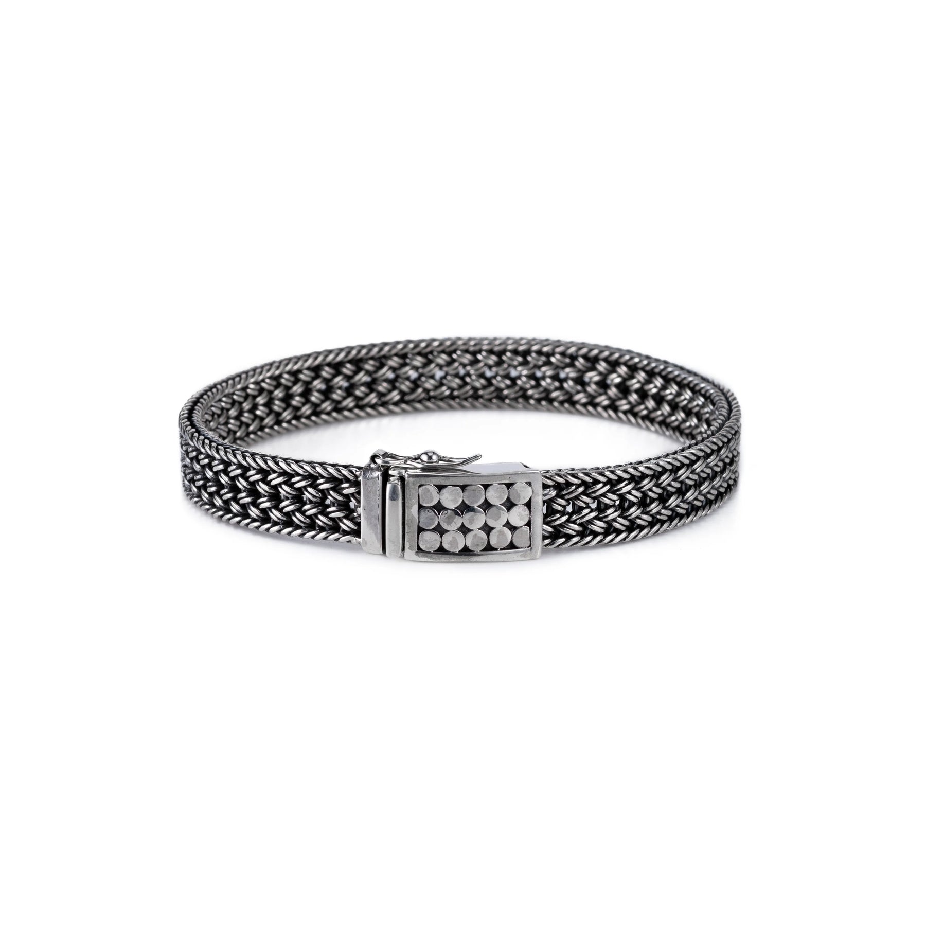 A sterling silver bracelet with a thicker, woven band and a decorative seamless clasp.