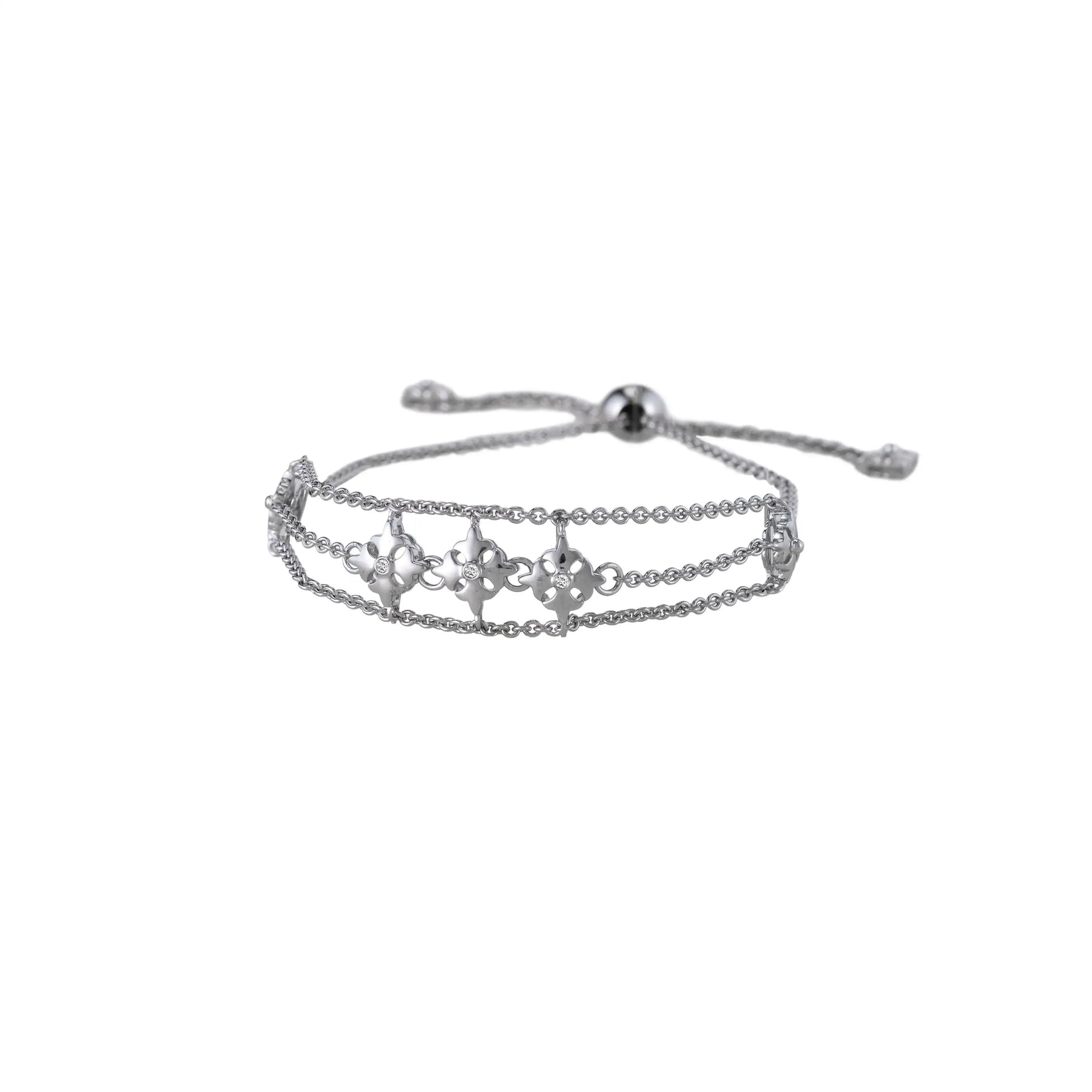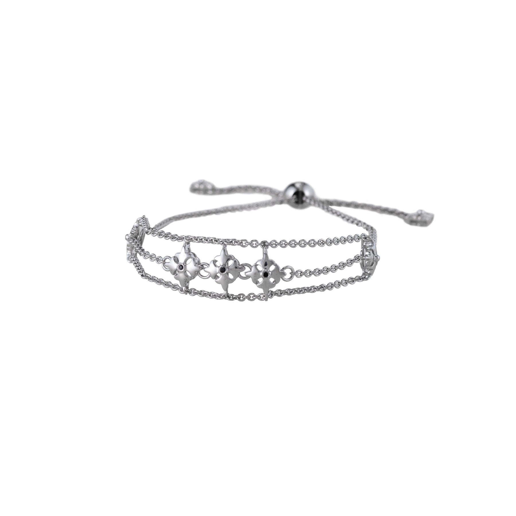 An adjustable sterling silver bracelet with a uniquely designed centerpiece - three KIR insignia pendants suspended between three sterling silver chains, each adorned with a mini round stone centerpiece.