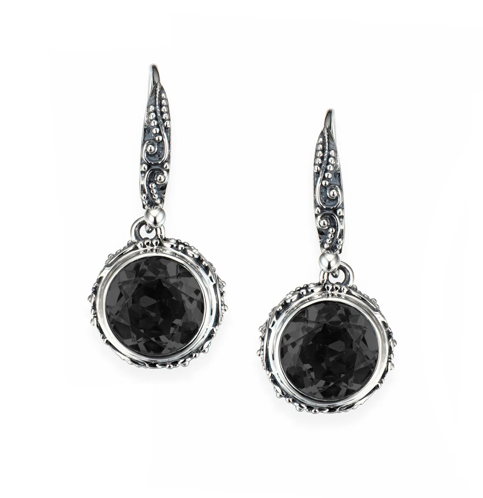 A classic pair of sterling silver hook earrings with a bold round stone centerpiece, delicately held in an ornate silver setting that surrounds the stone and the front of the hook earring base.
