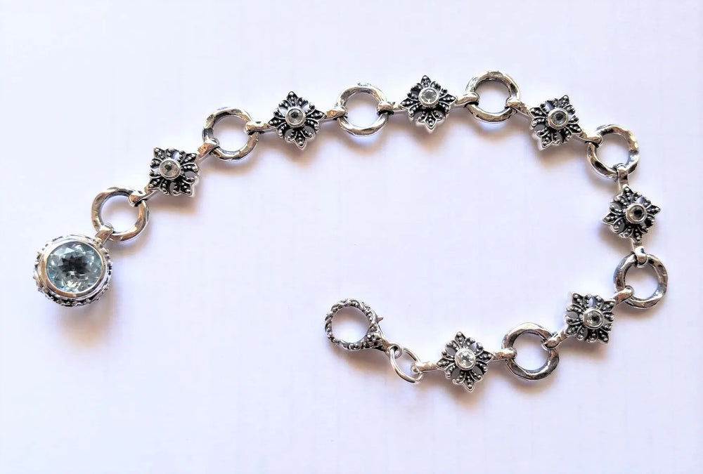 Black Onyx, White Topaz, Sky Blue Topaz, Green Amethyst, Purple Amethyst, White Mabe Pearls, and occasionally Stick Pearls, Garnet Moonstone Labradorite and London Blue Topaz.