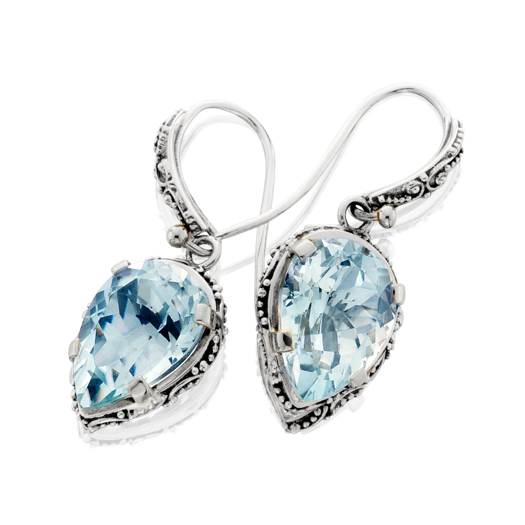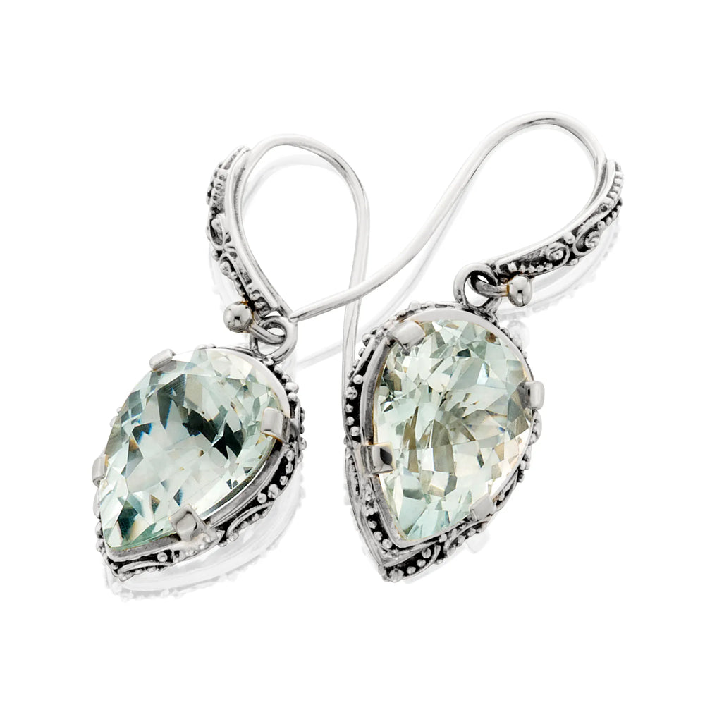Black Onyx, White Topaz, Sky Blue Topaz, Green Amethyst, Purple Amethyst, White Mabe Pearls, and occasionally Stick Pearls, Garnet Moonstone Labradorite and London Blue Topaz.