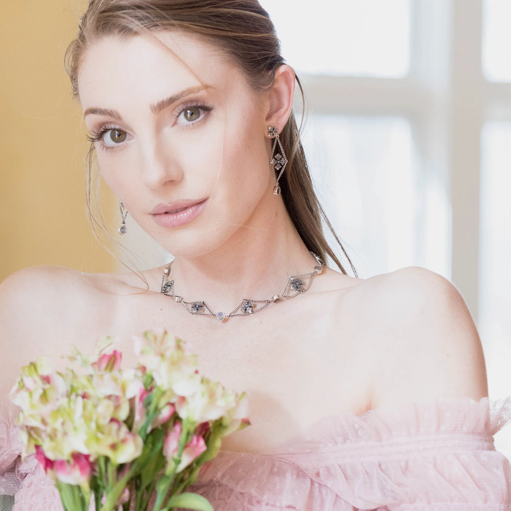 Gemstone Pave Triple Row Necklace - Hammered Link Chain