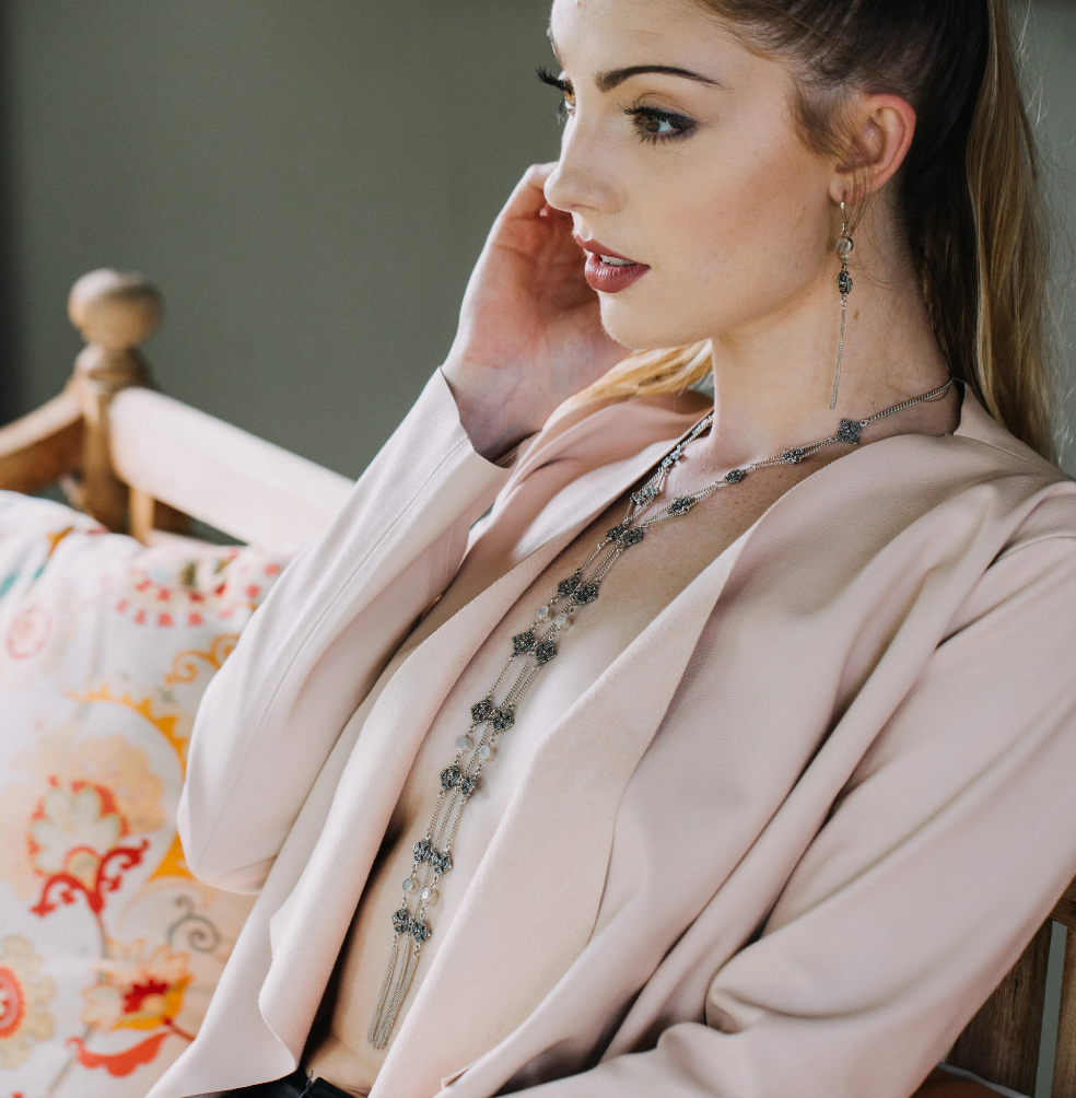 Sterling silver necklace featuring hanging strands of chain tassel embellished with round gemstones and KIR logo designs.