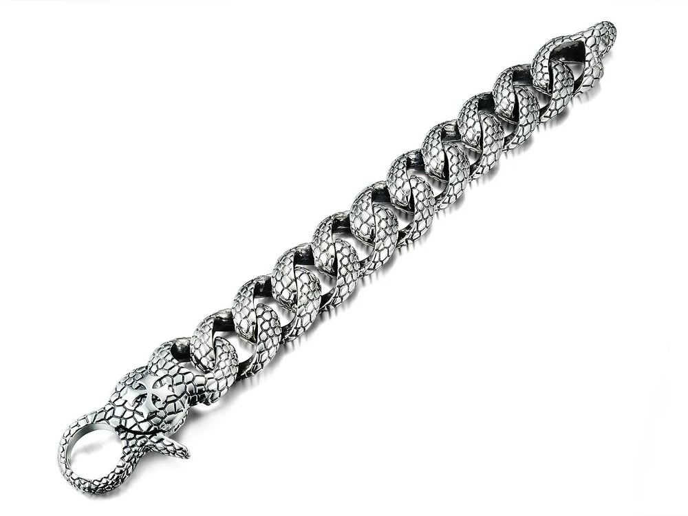 A sterling silver bracelet with a thick band decorated with scale-like detailing.