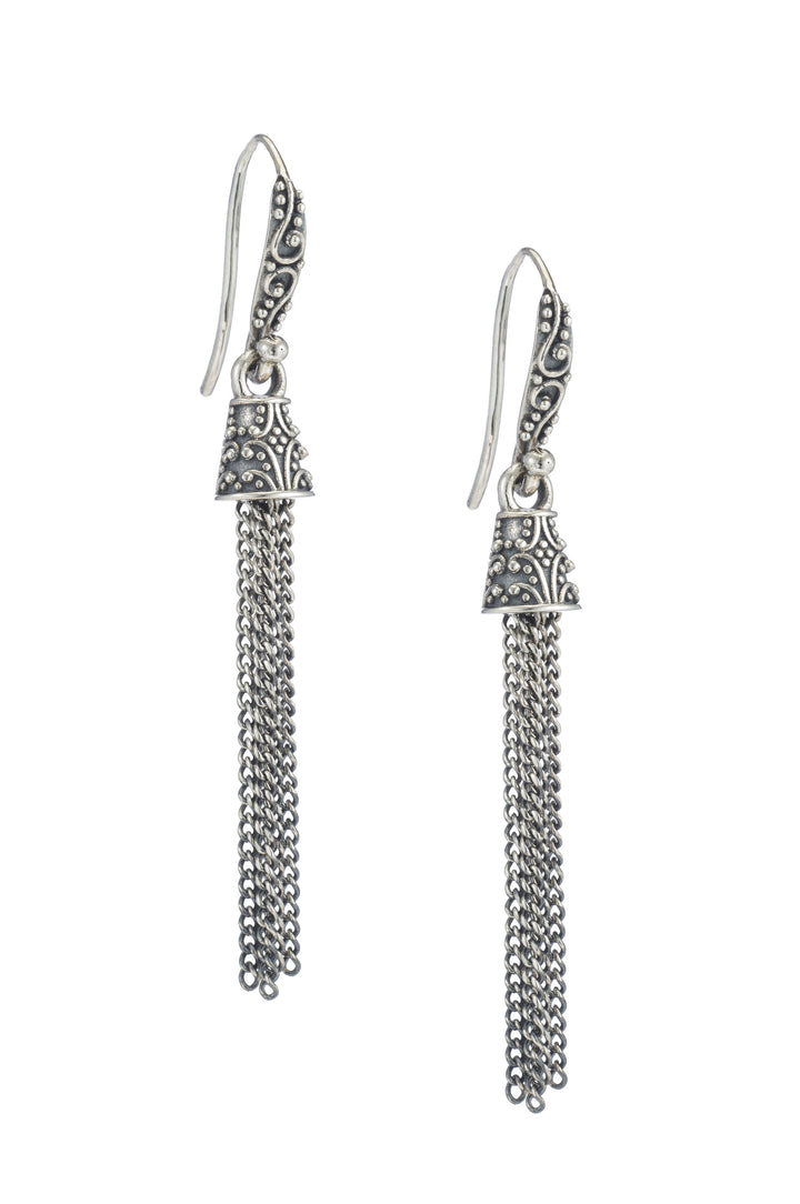 Small sterling silver earrings featuring curb chain tassels and caps adorned with granulation details, suspended from a French wire.