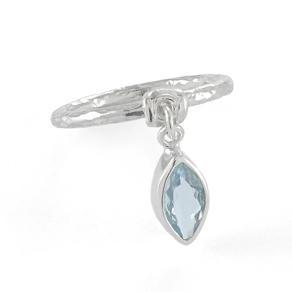 A sterling-silver statement ring with a dainty oval druzy stone centerpiece settled in a textured, stud-like silver setting. The stone setting is embedded in the ring itself, which is thicker at the top, and gradually thinner as it reaches the bottom of the band.